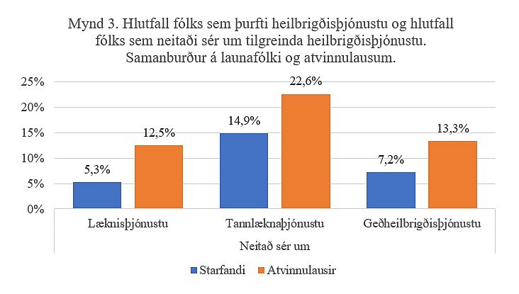 Atvinnulaust fólk var einnig líklegra til að hafa neitað sér um hvers kyns heilbrigðisþjónustu á undangengnum sex mánuðum. Þannig höfðu 12,5% neitað sér um læknisþjónustu (samanborið við 5,3% launafólks), 22,6% um tannlæknaþjónustu (samanborið við 14,9% launafólks) og 13,3% um geðheilbrigðisþjónustu (samanborið við 7,2% launafólks). Algengasta uppgefna ástæðan fyrir því að hafa neitað sér um heilbrigðisþjónustu var kostnaður, eða upp í um 70% tilfella. Kostnaður við ýmsa heilbrigðisþjónustu er klárlega fyrirstaða og meiri fyrirstaða því lægri og ótryggari sem tekjurnar eru. Þannig nefndu 87,6% atvinnulausra kostnað sem ástæðu fyrir því að hafa neitað sér um heilbrigðisþjónustu en hlutfallið var einnig hátt, en þó lægra á meðal launafólks sem hafði neitað sér um slíka þjónustu, eða 76,6%.