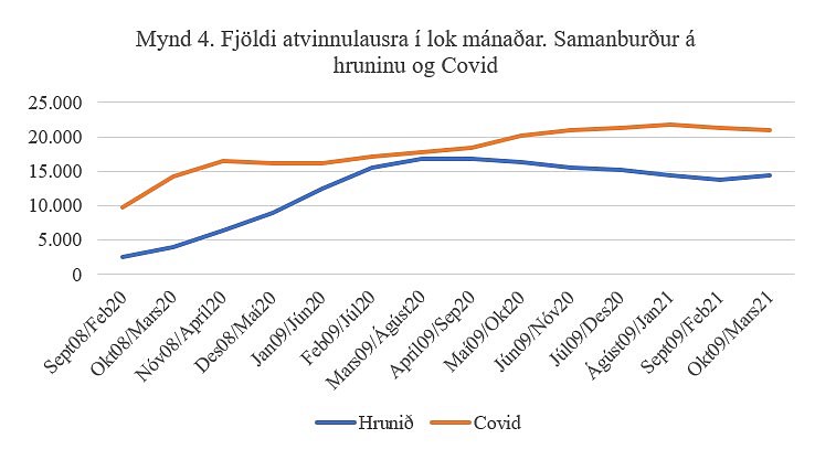 Atvinnuleysi hefur leikið stærra hlutverk í Covid-kreppunni en í kjölfar hrunsins. Þróun fjölda atvinnulausra hefur líka verið með öðru móti en í kjölfar hrunsins. Í mynd 4 ber ég saman þróun fjölda atvinnulausra í þessum tveimur efnahagskreppum. Upphafspunktarnir eru september 2008 og febrúar 2020, sem má líta á sem síðustu mánuðina áður en að kreppurnar brustu á.