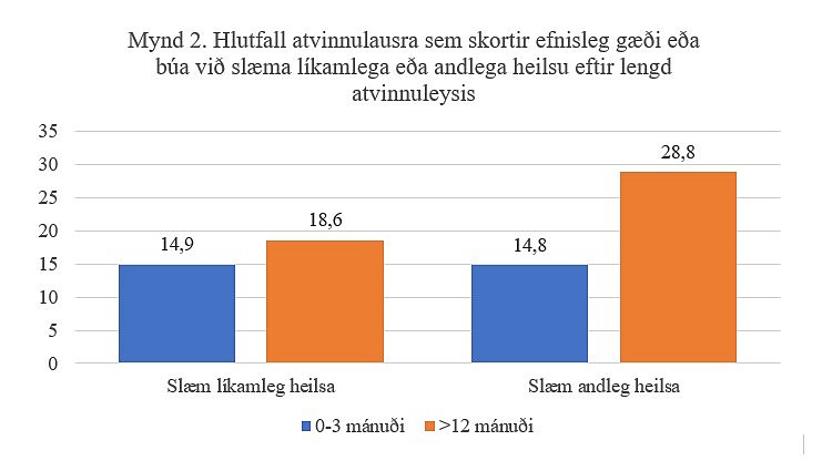 Nýlega framkvæmdi Varða – Rannsóknastofnun vinnumarkaðarins könnun á meðal meðlima aðildarfélaga ASÍ og BSRB. Í gögnunum má finna vísbendingar um áhrif atvinnuleysis á heilsufar. Þannig mátu til dæmis 16,6% atvinnulausra líkamlega heilsu sína slæma, samanborið við 12,1% þeirra sem voru starfandi. Það er öllu meira sláandi að bera saman andlega heilsu þessara hópa. Rúm 23% atvinnulausra mældust með þunglyndiseinkenni á PHQ-9 skalanum samanborið við 7,6% launafólks.