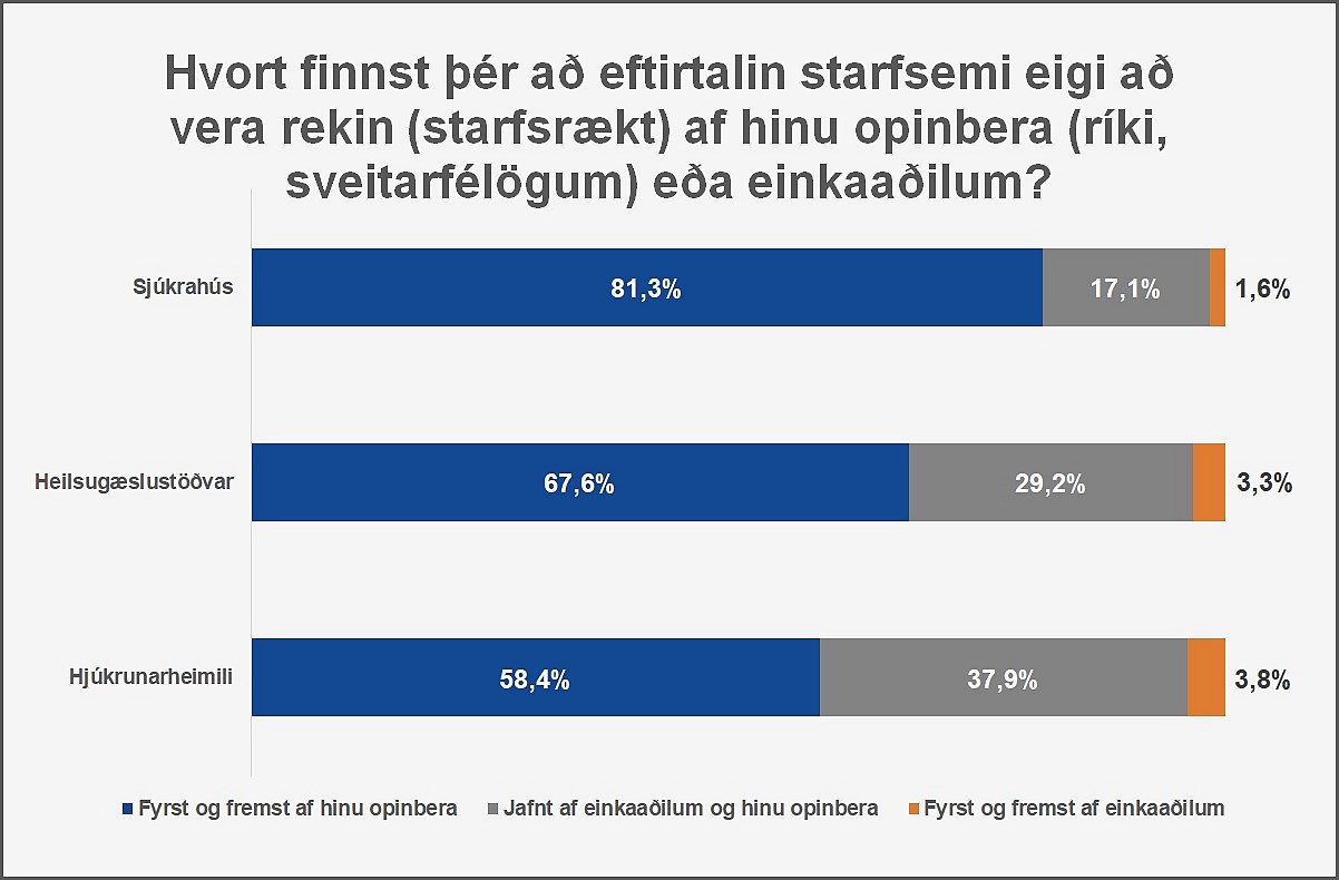 Alls vilja um 81,3 prósent landsmanna að rekstur sjúkrahúsa sé fyrst og fremst á hendi hins opinbera, það er ríkis og sveitarfélaga. Örlítill minnihluti, um 1,6 prósent, vilja að sjúkrahús verði fyrst og fremst að vera rekin af einkaaðilum. Rúmlega tveir þriðju hlutar þjóðarinnar, um 67,6 prósent, vilja að starfsemi heilsugæslustöðva sé fyrst og fremst rekin af hinu opinbera. Aðeins 3,3 prósent vilja að heilsugæslustöðvarnar verði aðallega eða eingöngu starfræktar af einkaaðilum. Þá vill meirihluti landsmanna, um 58,4 prósent, að hjúkrunarheimili verði rekin af hinu opinbera, en aðeins um 3,8 prósent vilja rekstur þeirra aðallega eða eingöngu í höndum einkaaðila.