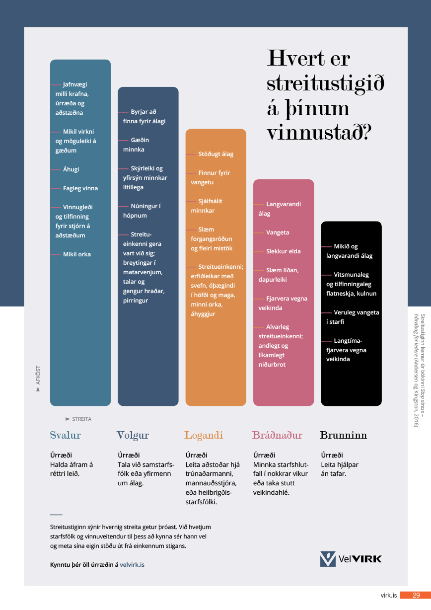 Í ársriti Virk starfsendurhæfingarsjóð er fjallað um streitustig á vinnustöðum. Þar er m.a. að finna svonefndan streitustiga sem gefur glögga mynd af líðan starfsmanns sem mátar sig við hann. Honum er skipt í fimm þrepa súlur sem skýra álagið og lýsir líðan í samræmi við það. Launafólk á Íslandi þekkir vel álag í starfi og nauðsynlegt er að vinda ofan af því. Virk hefur gríðarlega reynslu í að takast á við slíka streitu hjá launafólki og hjálpa því að vinda ofan af henni.