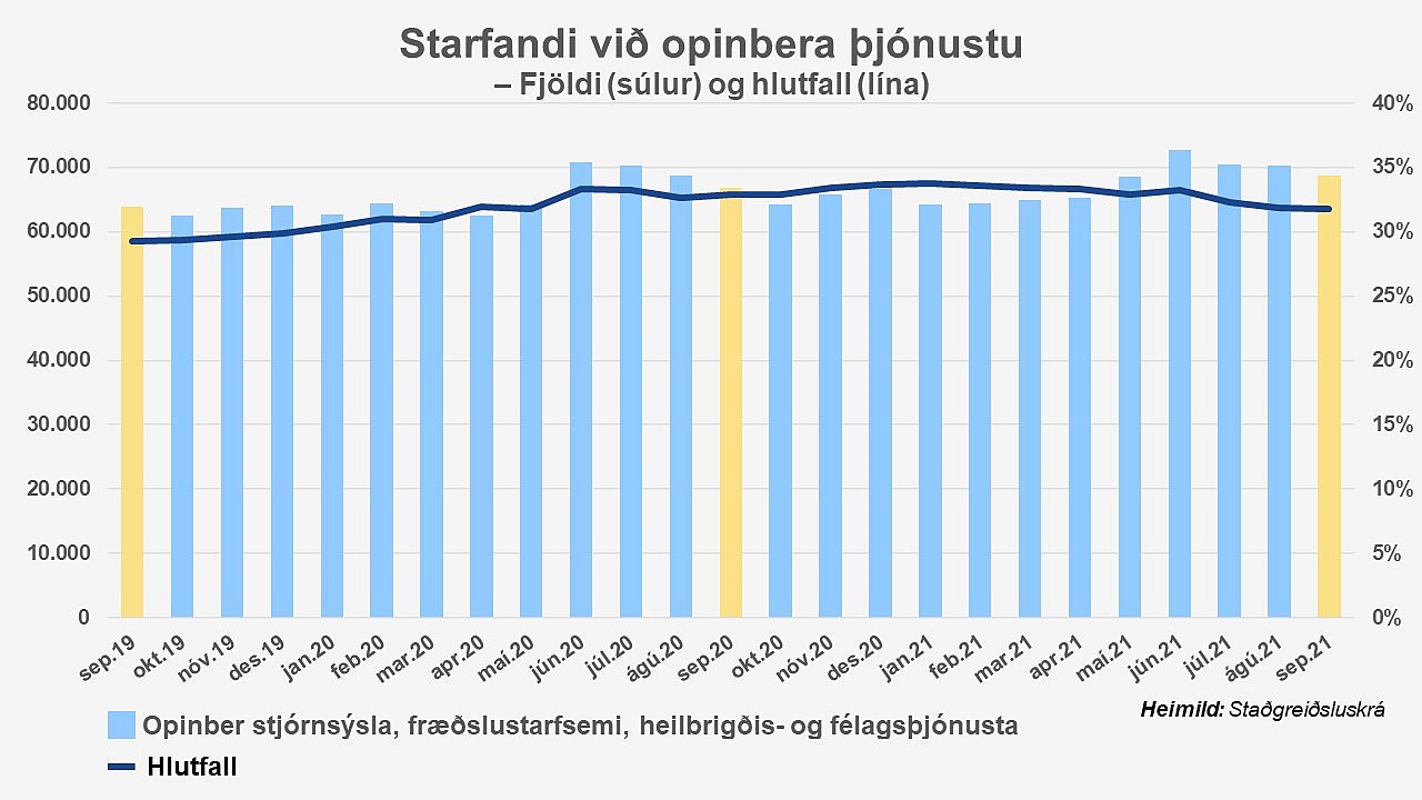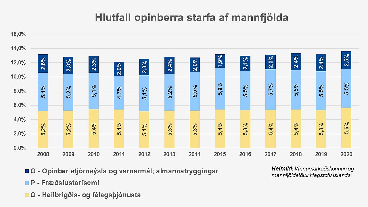 Þegar fjöldi opinberra starfsmanna er skoðaður í samhengi við fjölda landsmanna hefur hlutfallið verið svipað frá árinu 2008, í kringum 13 prósent. Lítilleg hlutfallsleg fjölgun hefur verið síðustu tvö ár en hún tengist fyrst og fremst heimsfaraldrinum.