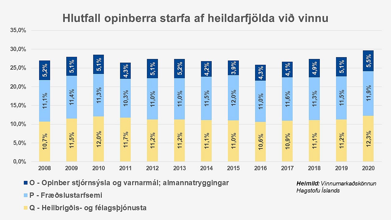 Almennt er ekki að sjá að miklar breytingar hafi verið á því hve hátt hlutfall starfar innan þeirra atvinnugreina sem skilgreina má sem opinberar greinar á árunum 2008 til 2020, eins og sjá má á myndinni hér að neðan. Hlutfallið hækkar nokkuð árið 2009 vegna fækkunar starfa á almennum markaði í kjölfar hrunsins, en breytist svo lítið allt til 2019. Allnokkur aukning verður árið 2020, en hækkandi hlutfall það ár skýrist fyrst og fremst af fækkun starfa á almennum markaði.
