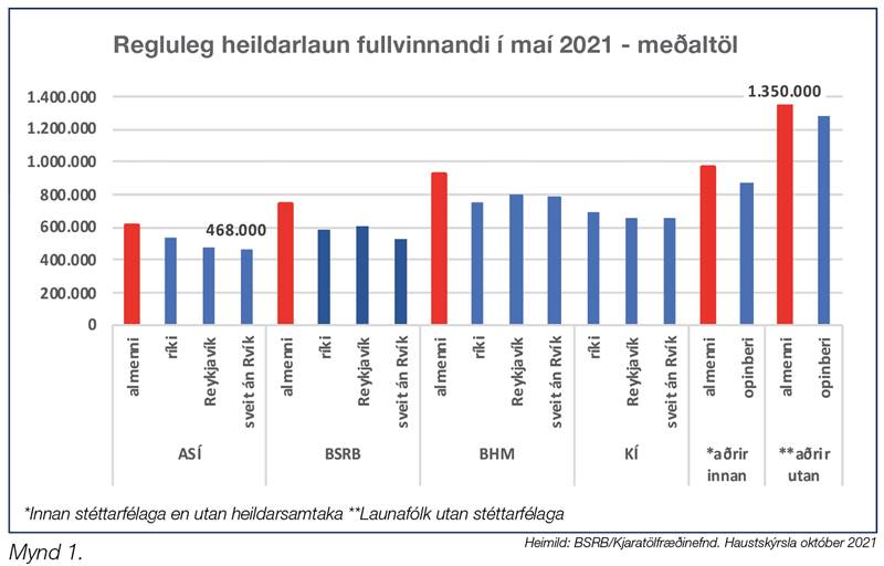 Aðilar vinnumarkaðarins standa saman að því að halda úti rannsóknarstarfi Kjaratölfræðinefndar. Í haustskýrslu sinni í október 2021 birti nefndin yfirgripsmikil gögn þar sem m.a. kemur fram samanburður á reglulegum heildarlaunum milli félagsmanna heildarsamtaka launafólks. Á mynd 1 kemur fram samanburður á launum hjá ólíkum vinnuveitendum sem stéttarfélög innan heildarsamtakana semja við. Á myndinni sést að hæstu launin í samanburði milli allra heildarsamtaka fá þeir sem starfa á almennum markaði. Vert er að draga fram í þessu sambandi að þarna kemur fram birtingarmynd launaójöfnuðar milli opinbera og almenna launamarkaðarins sem á að leiðrétta samkvæmt samningi milli samtaka launafólks í almannaþjónustu og opinberra launagreiðenda, um jöfnun launa á milli markaða. Sá samningur var gerður 2016 og hljóðar upp á leiðréttingu launa opinberra starfsmanna um að meðaltali tæp 17% og er það sá munur milli sambærilegra hópa þar sem laun á almenna markaðnum eru hærri en hjá hinu opinbera. Þennan launamun á að leiðrétta í áföngum fyrir árið 2026 og um leiðréttingu er að ræða sem telst ekki til launahækkana samkvæmt kjarasamningum. Þessi leiðrétting er annar hluti leiðréttingarinnar sem samið var um á vinnumarkaði 2016, en hinn hlutinn var leiðrétting lífeyrisréttar hjá starfsmönnum á almennum markaði. Rétt er að minna á að launaleiðréttingin á almenna markaðnum hefur að fullu verið framkvæmd.