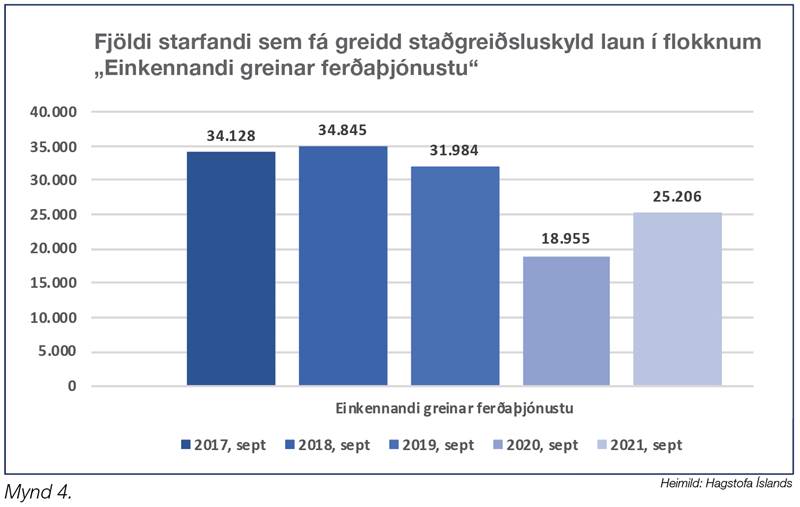 Mynd 4 sýnir ágætlega hvað hefur verið að gerast á íslenskum vinnumarkaði undanfarin ár. Erfiðleikar steðjuðu að ferðaþjónustunni á árunum frá 2018 og 2019, það er að segja áður en Covid-19 faraldurinn hófst. Þá var atvinnugreinin að sigla inn í rekstrarerfiðleika og ein birtingarmynd þess var að starfsmönnum á launaskrá fækkaði milli ára um 3.000. Gott er að hafa í huga að í þessum tölum er einungis verið að fjalla um þá starfsmenn sem voru á launaskrá hjá ferðaþjónustufyrirtækjum en ekki allan þann fjölda sem var starfandi við greinina í stökum verkefnum sem einyrkjar eða verktakar. Stóri skellurinn kemur svo milli 2019 og 2020 þegar Covid-19 leggst yfir samfélagið af fullum þunga og starfsmönnum ferðaþjónustunnar fækkar um 40,7%. Það jákvæða sjáum við síðan gerast milli 2020 og 2021 þegar við öll sem samfélag mokum fjármunum okkar úr sameiginlegum sjóðum inn í atvinnugreinarnar, einkum í ferðaþjónustuna, til að hjálpa fyrirtækjunum við að halda sjó og tryggja eftir mætti starfsmönnum þeirra vinnu og starfsmönnum fjölgar á ný um 33%.
