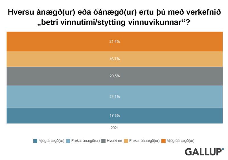 Heildaránægja með styttingu vinnuvikunnar er talsvert mikil. Aðeins 15 prósent eru óánægð með styttingu vinnuvikunnar og meira en sjö af tíu eru ánægð. Stór hluti innan 15 prósent óánægðra er starfsfólk sem vinnur í vaktavinnu við öryggis og eftirlitsstörf ásamt starfsfólki sem starfar við ræstingar.
