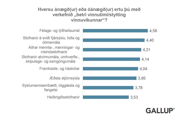 Mesta ánægjan er í stofnunum Félags og lýðheilsumála. Í könnuninni sést að mesta óánægjan er hjá heilbrigðisstofnunum, sýslumannsembættum, löggæslu og hjá starfsfólki í fangelsum. Komið hefur fram að þar sem mesta óánægjan ríkir með styttingu vinnuvikunnar hefur skort á að starfsfólkið taki beinan þátt í kerfisbreytingunni með umbótasamtali og umbótaverkefnum sem áður er getið um. Þá hefur skort á að stofnanir fjölgi starfssfólki til að mæta styttingunni og aukið fjármagn frá viðkomandi ráðuneytum sem fylgja átti kerfisbreytingunni skili sér inn til stofnana.