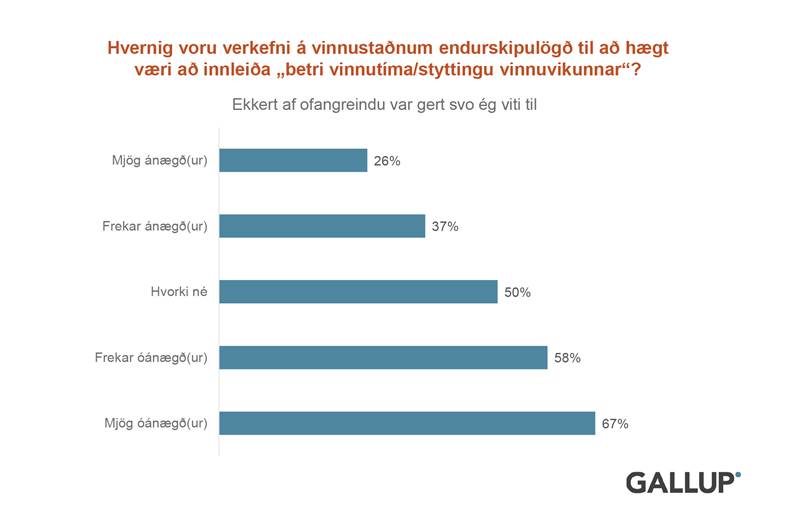 Sterkt samband er milli hvort gripið var til aðgerða og ánægju með styttingu vinnuvikunnar og hvort starfsfólkið hafi verið þátttakendur þegar vinnuvikan var stytt. Tveir af hverjum þremur sem eru „mjög óánægðir“ segja að „ekkert hafi verið gert“ en aðeins einn af fjórum meðal þeirra sem eru „mjög ánægðir“ taka undir það. Þá sögðust 67 prósent innan vaktavinnukerfa mjög óánægð með endurskipulagningu vinnuvikunnar.