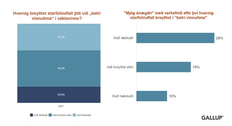 Tæp 34 prósent þeirra sem vinna vaktavinnu segja að starfshlutfallið hafi hækkað vegna styttingu vinnuvikunnar og rúmlega 26 prósent að það hafi lækkað. Þegar skoðað er ánægja með starfshlutfallið í vaktavinnu eftir breytingarnar segja 26 prósent starfsfólks í vaktavinnu vera mjög ánægt með að það hafi lækkað, 18 prósent er mjög ánægt með að það breyttist ekki og 10 prósent mjög ánægt með að starfshlutfallið hækkaði.
