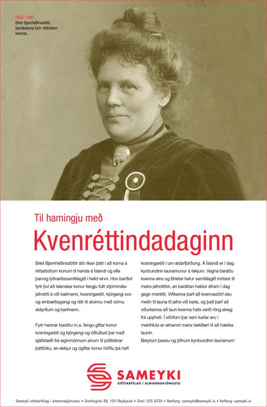 Sameyki stendur með jafnréttisbaráttunni og í dag höldum við upp á kvenréttindadaginn sem helgaður er baráttudegi kvenna. Bríet Bjarnhéðinsdóttir átti ríkan þátt í að koma á réttarbótum konum til handa á Íslandi og efla þannig lýðræðissamfélagið í heild sinni. Hún barðist fyrir því að íslenskar konur fengju fullt jafnrétti á við karlmenn; kosningarétt, kjörgengi svo og embættisgengi og rétt til atvinnu með sömu skilyrðum og karlmenn.