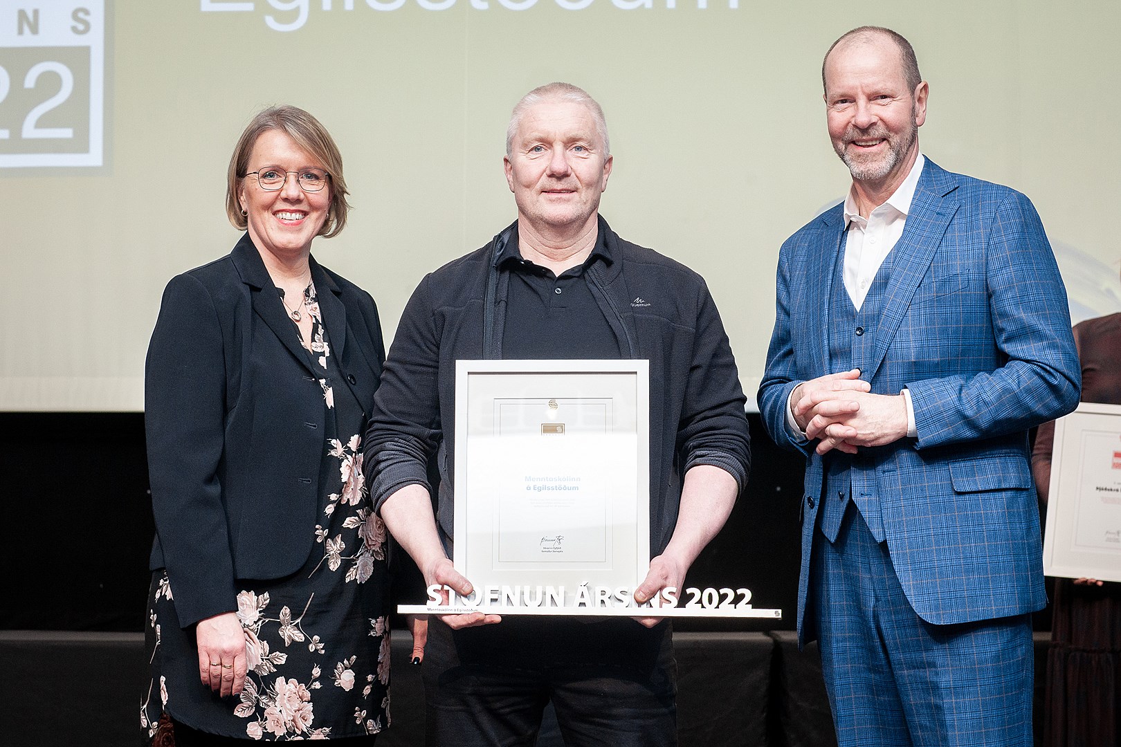 Þórarinn Eyfjörð formaður Sameykis, Ingibjörg Sif Sigríðardóttir varformaður og Árni Ólason, skólameistari Menntaskólans á Egilsstöðum sem tók á móti viðurkenningunni.