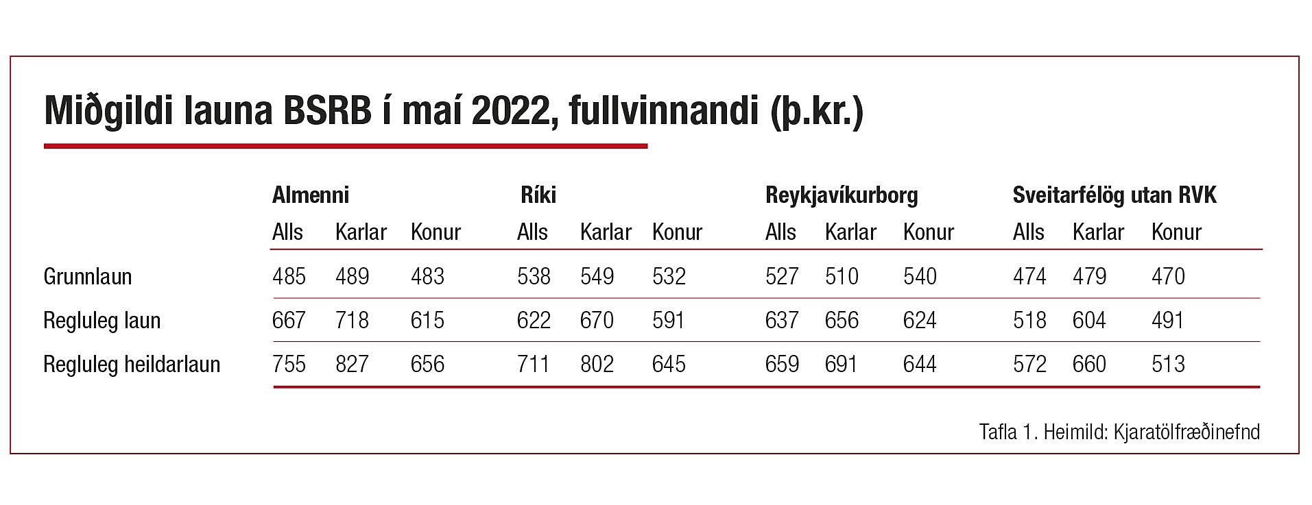 Við skoðun á launum félagsmanna BSRB í maí á síðasta ári má sjá að grunnlaun þeirra voru á bilinu 470–549 þ.kr., regluleg laun á bilinu 491–718 þ.kr. og regluleg heildarlaun á bilinu 513–827 þ.kr. Í öllum fyrrgreindum flokkum voru launin lægst hjá konum sem starfa hjá sveitarfélögum utan Reykjavíkur. Launamunur kynjanna er mestur þegar litið er til reglulegra heildarlauna, eða á bilinu 7% til 29%.