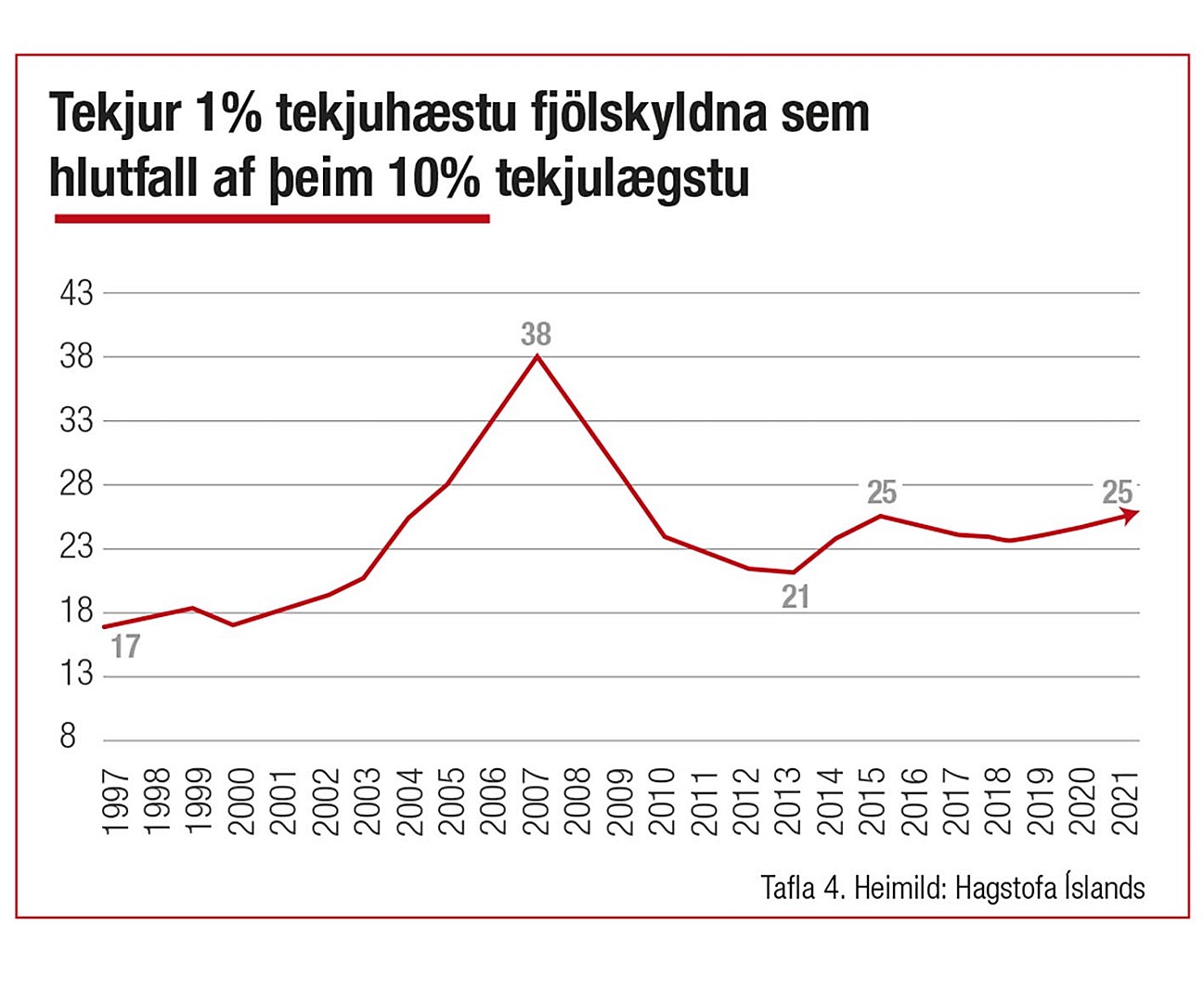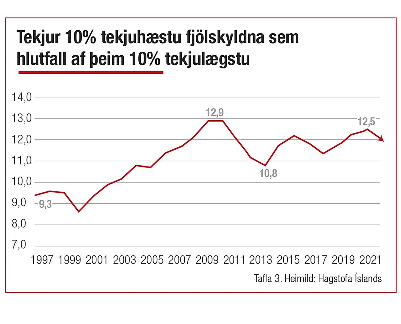 Þegar borin er saman hlutdeild tekjuhæstu 10% fjölskyldnanna við þær 10% sem eru tekjulægstar má sjá að árið 1997 voru þær 10% tekjuhæstu með 9,3 sinnum hærri ráðstöfunartekjur en þær sem voru með lægstu 10% tekjurnar. Þessi ójöfnuður náði hámarki á árunum fyrir hrun, lækkaði síðan í kjölfarið en hefur verið að hækka aftur. Voru ríkustu 10% með 12,5 sinnum hærri tekjur en þau 10% tekjulægstu árið 2020. Munurinn er enn meiri þegar litið er til ríkasta 1% fjölskyldnanna og þeirra 10% sem lægst hafa launin. Þar var ríkasta 1% með 17-faldar tekjur tekjulægsta hópsins árið 1997 og rauk upp í 38-faldan mun árið 2007. Sá munur lækkaði á árunum eftir hrun en hefur hækkað aftur og stóð í 25 árið 2021.