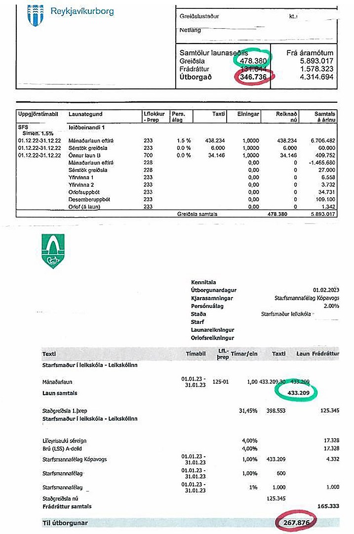 Sonja Ýr segir: „Ef þið skoðið þessa launaseðla fyrir laun í ársbyrjun 2023 sjáið þið mat samfélagsins á virði starfa leiðbeinenda á leikskólum. Launin eru þó ögn skárri í Reykjavík heldur en í Kópavogi eða öðrum sveitarfélögum. Þar munar heilum 45 þúsund krónum á mánuði fyrir skatt (sjá grænu hringina). Það er vegna þess að Reykjavíkurborg greiðir sérstakar aukagreiðslur vegna þessara starfa sem hin sveitarfélögin gera ekki. Og neita að gera. Þau hafa hafnað sjálfsögðum kröfum okkar fólks um sömu laun fyrir sömu störf á leikskólum um landið allt. Gætuð þið lifað af á þessum launum?“