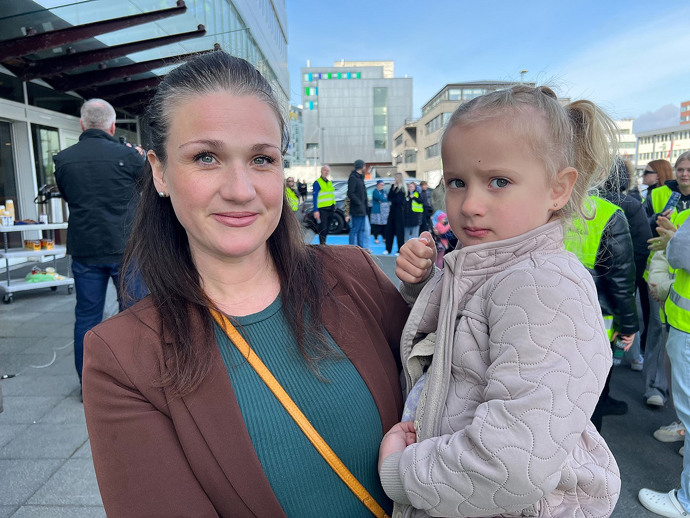 Astrid með dóttur sína á arminum á mótmælafundinum í morgun.