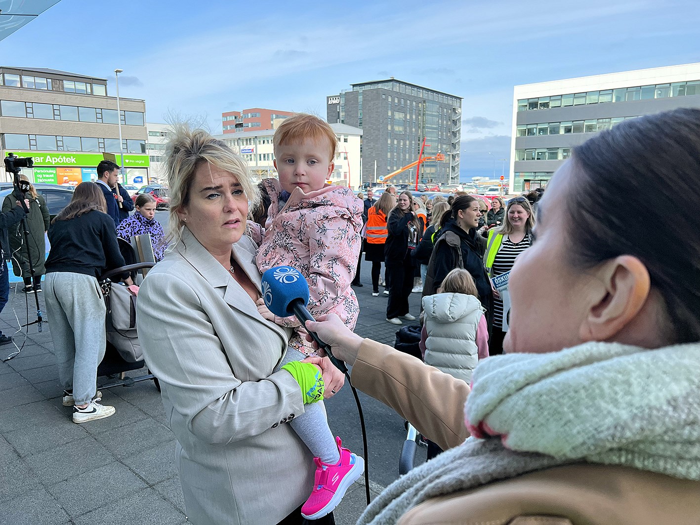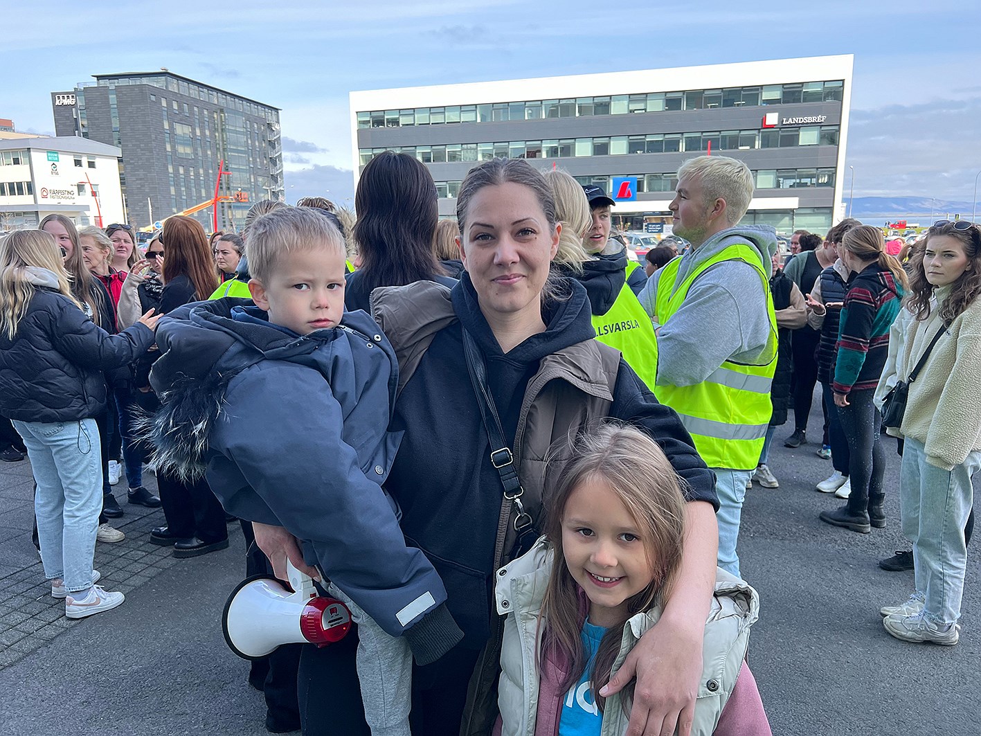 Þrjár kraftmiklar mæður, með börn sín á arminum efndu til mótmæla í morgun við skrifstofur Sambands íslenskra sveitarfélaga í Borgartúni og kröfðust þess að sambandið gengi þegar í stað frá kjarasamningi við BSRB. Þær sögðu að kröfurnar væru réttmætar og réttlátar fyrir launafólk sem sinnir mikilvægustu störfunum í sveitarfélögunum, og gera það á lægstu laununum. Þær kröfðust þess að sambandið greiddi þeim sömu laun fyrir sömu störf. Nokkur fjöldi fólks var saman komin í Borgartúni og krafðist þess sama. Þessar kraftmiklu konur sem stóðu fyrir mótmælunum heita Astrid Jóhanna Kristjánsdóttir, Erla Þórdís Traustadóttir og Esther María Ragnarsdóttir.