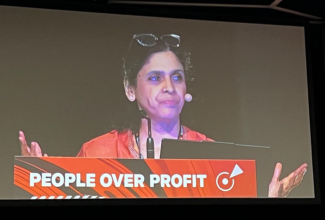 „Opinberar stofnanir verða háðar tækninni með þeim hætti að upplýsingar eru keyptar frá einkafyrirtækjum, risum í tæknigeiranum eins og Google sem raka til sín opinberu féi. Stéttarfélög og opinberar stofnanir ríkisins hafa einnig þurft að bregðast við ofgreiðslum til tæknifyrirtækja. Það er ekkert samhengi í því hvernig tæknirisarnir komast hjá því að greiða skatta af sínum arði í löndum af féi sem kemur úr opinberum sjóðum. Tæknirisarnir eru snjallir og leika á kerfin með því að útvista störfum um allan heim og þannig flytja þekkinguna, peninga og störfin úr landi. Allir eiga í raun rétt á því að hafa geiðan aðgang að upplýsingum um hvernig algóritminn og gervigreindin er notuð í opinberum störfum. Við þurfum að krefjast þess í gegnum stéttarfélög og samstöðuna sem því fylgir að hafa aðgang og gagnsæi á þessu sviði. Starfsfólk á rétt á því hvernig tæknivæðingin er innleidd á opnberum vinnustöðum og að störf launafólks séu vernduð fyrir þessari nýlendustefnu tæknirisanna sem vilja leysa fólk af hólmi, og hverjum langar til að leysa fólk af hólmi fyrir t.d. vélmenni og gervigreind?,“ sagði Anita.