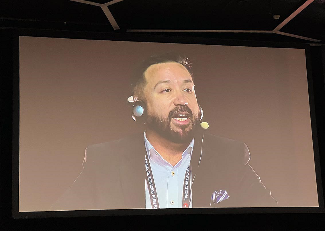 „Við verðum að vernda opinber störf! Eftir COVID-19 faraldurinn áttuðu stéttarfélögin og starfsfólk í opinberri þjónustu að tæknivæðingin dundi yfir það í faraldrinum og það þurfti að aðlagast henni hratt. Við lærðum líka að ýmsar opinberar stofnanir sátu samt eftir því ekki var til löggjöf yfir hvernig og hvort ætti að innleiða nýja tækni og veita fjármunum í það. Þess vegna verðum við að búa til löggjöf um innleiðingu á nýrri tækni, bæði til að vernda störf, efla upplýsingu og bæta opinbera þjónustu. Tæknivæðingin á að þjóna fólki en ekki öfugt. Vinnum saman að því að búa til stefnu á vettvangi PSI til að vernda opinber störf fyrir tæknirisunum. Leiðtogar opinberra stéttarfélaga skipta öllu máli til að við náum árangri,“ sagði Juan Carlos Hidalgo frá Chile.
