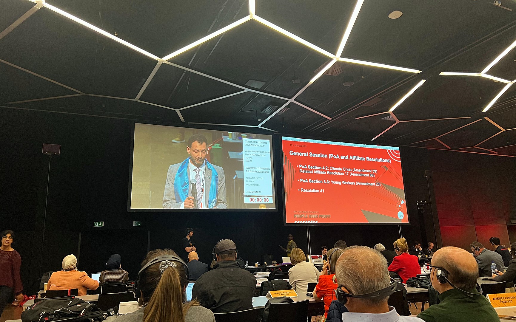 Að því loknu var fjallað um loftslagsbreytingar af mannavöldum. Fulltrúar þingsins sögðu í ræðum sínum að loftslagbreytingar vaxa enn hraðar en sérfræðingar hafa spáð fyrir um og íbúar í öllum heimsálfum þjást vegna afleiðinganna. Það sem knýr áfram lofslagsbreytingarnar eru kröfur einkafyrirtækja um hagnað á því að reka vatnsvirkjanir og orkuver sem áður voru í opinberri eigu ásamt orkufrekum einkarekstri. Það sé m.a. af þessum ástæðum að stéttarfélögin verða að bregðast við í fullri alvöru í sínum löndum og krefjast þess af stjórnvöldum að þau taki til baka auðlindir, orkufyrirtæki og vatnsveitur í sína umsjá og rekstur. Þá þurfa stéttarfélögin að fræða og upplýsa sitt félagsfólk um staðreyndir og afleiðingar loftslagsbreytinganna. Auk þess þarf að hleypa ungu fólki að í verkalýðshreyfingunni, gefa þeim röddu, því þau munu erfa jörðina og búa við afleiðinginar hlýnun jarðar.