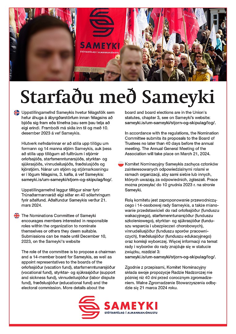 The Nominations Committee of Sameyki encourages members interested in responsible roles within the organization to nominate themselves or others they deem suitable. Submissions can be made until December 10, 2023, on the Sameyki website, see form here.