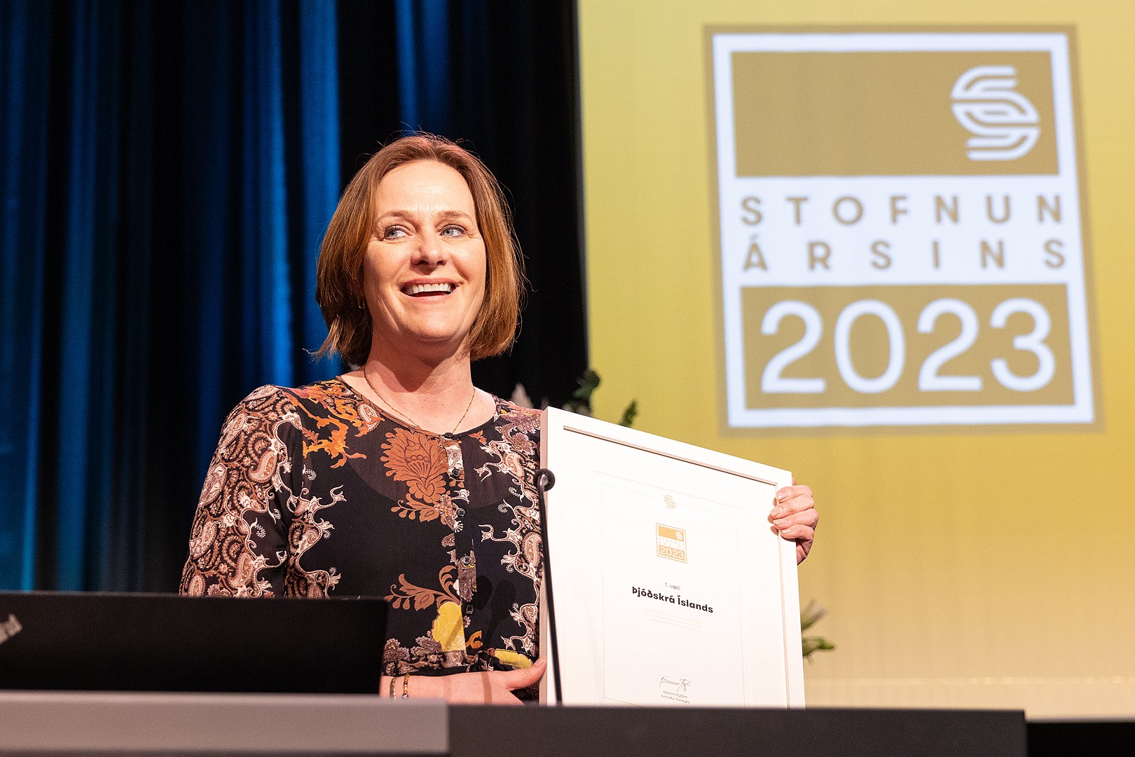 Hildur Ragnarsdóttir, forstjóri Þjóðskrár, tók á móti viðurkenningunni. Ljósmynd/BIG