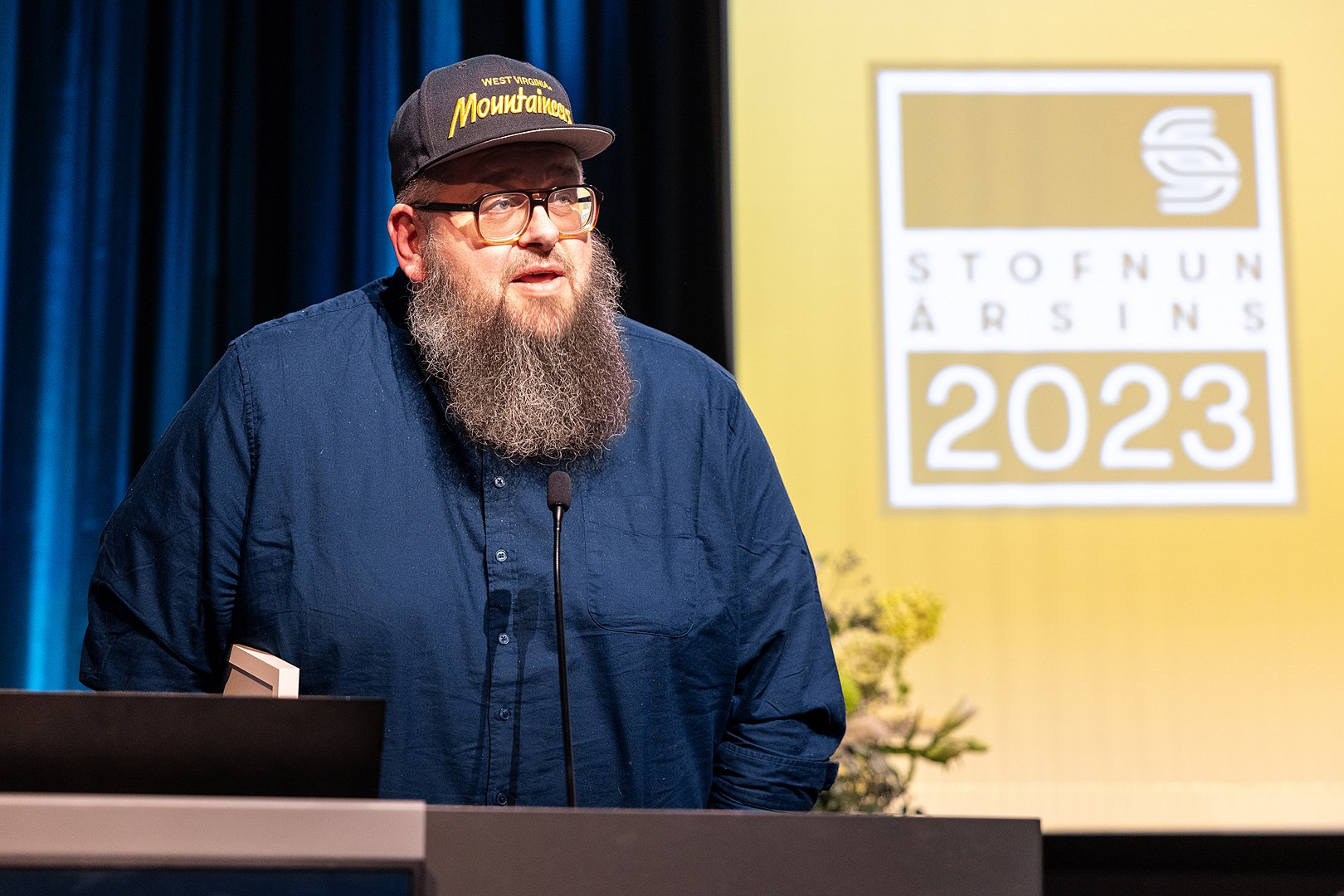 Njörður Njarðarson, forstöðumaður Félagsmiðstöðvarinnar Sygin hélt þakkarræðu á Stofnun ársins 2023. Ljósmynd/BIG.
