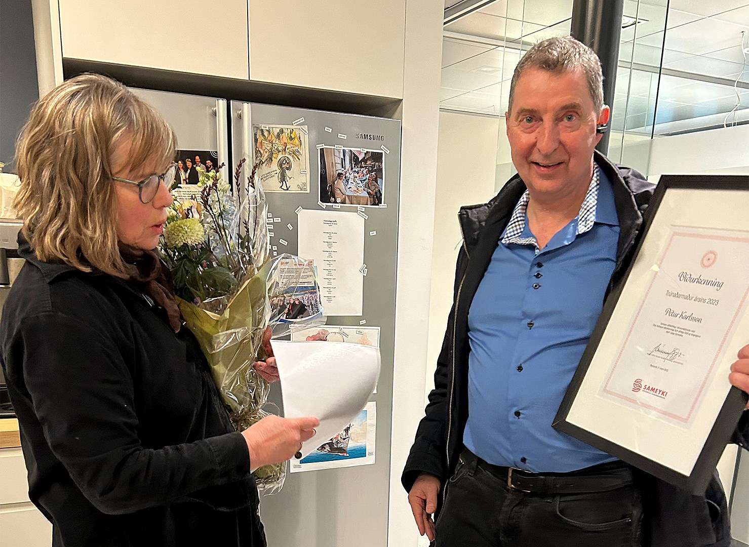 Jakobína Þórðardóttir færir Pétri Karlssyni viðurkenninguna á kaffistofu Sameykis í morgun.
