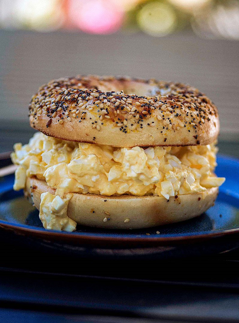 Næst er að hræra mæjónesi út í eggin. Sirka þremur sæmilega kúfuðum matskeiðum á móti sex eggjum. Þá fer edikblandaður laukurinn út í og krydd. Hálf teskeið af salti eða eftir smekk og einn þriðji af hvítum pipar. Sama magn af hvítlauksdufti. Gott að flækja ekki grunnuppskriftina um of en auðvitað hægt að bæta út í alls konar kryddi og jurtum. Að síðustu fara nokkrar slettur af eldpiparsósu eða góðu Dijon-mæjónesi. Hræra vel saman og þá er allt klárt og ekkert eftir nema að rista beyglu eða hvítasta brauð hússins.