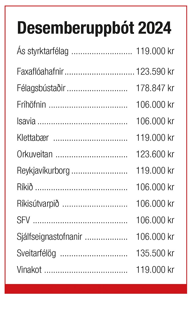 Starfsmaður sem er í starfi fyrstu viku nóvembermánaðar fær greidda desemberuppbót miðað við fullt starf tímabilið frá 1. janúar til 31. október. Desemberuppbót er föst krónutala og tekur ekki hækkunum samkvæmt öðrum ákvæðum kjarasamningsins og skal hún greidd út eigi síðar en 15. desember 2024.