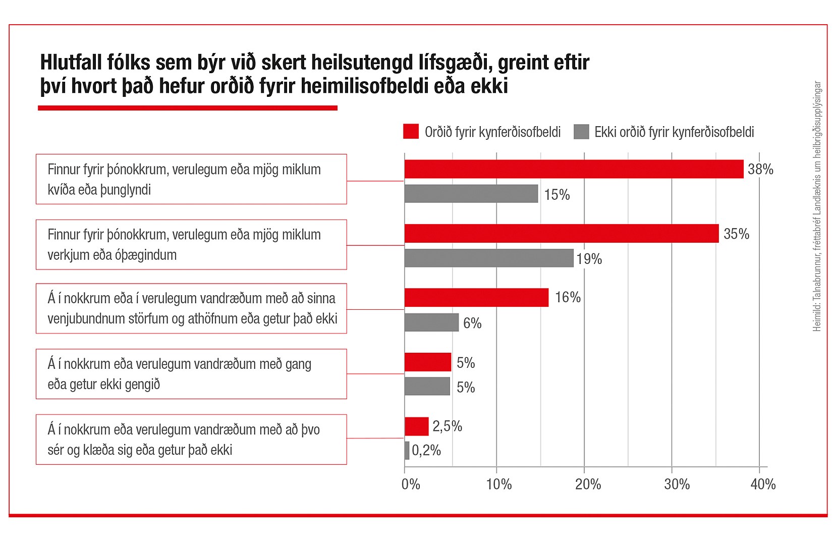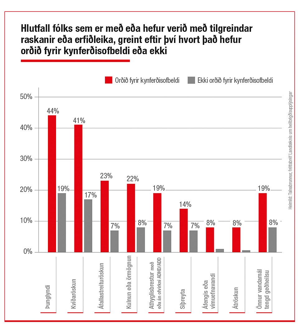 Alvarlegar afleiðingar kynferðisofbeldis eru staðfestar enn og aftur af landlækni sem nýverið gaf út niðurstöður um heilsu og líðan þolenda kynferðisofbeldis úr rannsókninni Heilsa og líðan á Íslandi (Talnabrunnur, tbl. 8, 2024). Þar er fólk sem orðið hefur fyrir kynferðisofbeldi borið saman við fólk sem ekki hefur orðið fyrir slíku ofbeldi og eru áhrifin á andlega og líkamlega líðan sláandi. Mun hærra hlutfall þeirra sem orðið hafa fyrir kynferðisofbeldi finnur fyrir kvíða eða þunglyndi, verkjum eða óþægindum auk þess að eiga í vandræðum með að sinna venjubundnum störfum og athöfnum.