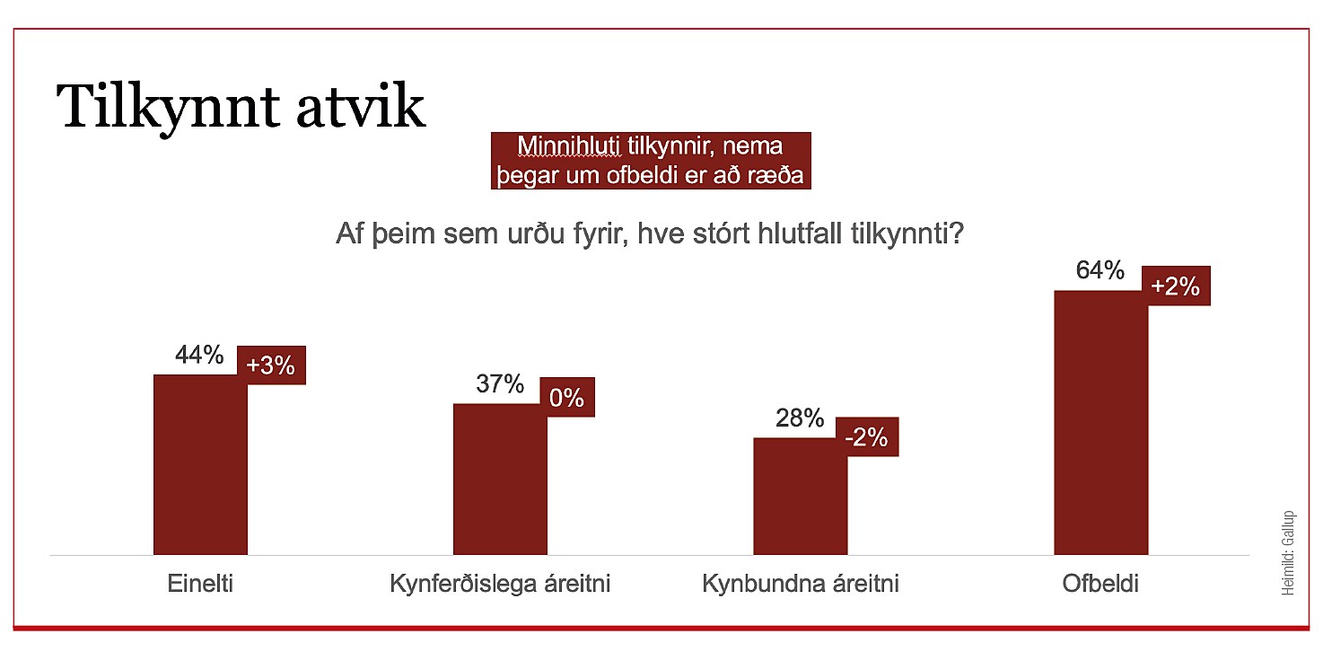 Þá sagði Tómas að samkvæmt könnuninn hafa 44 prósent þeirra sem hafa orðið fyrir einelti, EKKO, tilkynnt um það, 37 prósent þeirra sem beitt voru kynferðislegri áreitni tilkynntu um það, þau sem urðu fyrir kynbundinni áreitni og tilkynntu voru 28 prósent og 64 prósent þeirra sem urðu fyrir ofbeldi á vinnustað tilkynntu um það.