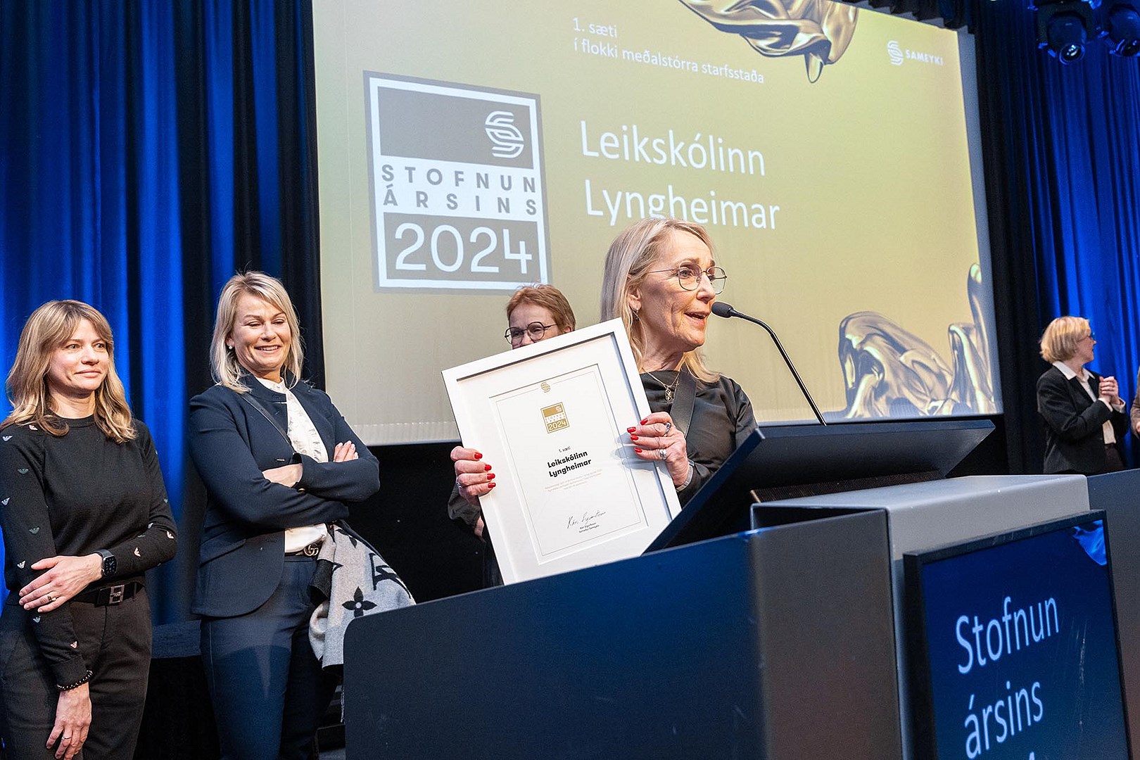 Kristín Helgadóttir, leikskólastjóri í Leikskólanum Lyngheimum stók á móti viðurkenningunni Stofnun ársins 2024.