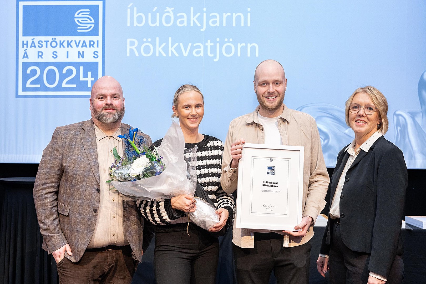Forstöðumaður og deildarstjóri hjá Íbúðakjarnanum Rökkvatjörn, Sigríður María Einarsdóttir og Garðar Þór Pétursson, deildarstjóri tóku á móti viðurkenningunni Hástökkvari ársins - borg og bær. Kári Sigurðsson, formaður Sameykis og Ingibjörg Sif Sigríðardóttir, varaformaður, afhentu þeim viðurkenninguna.