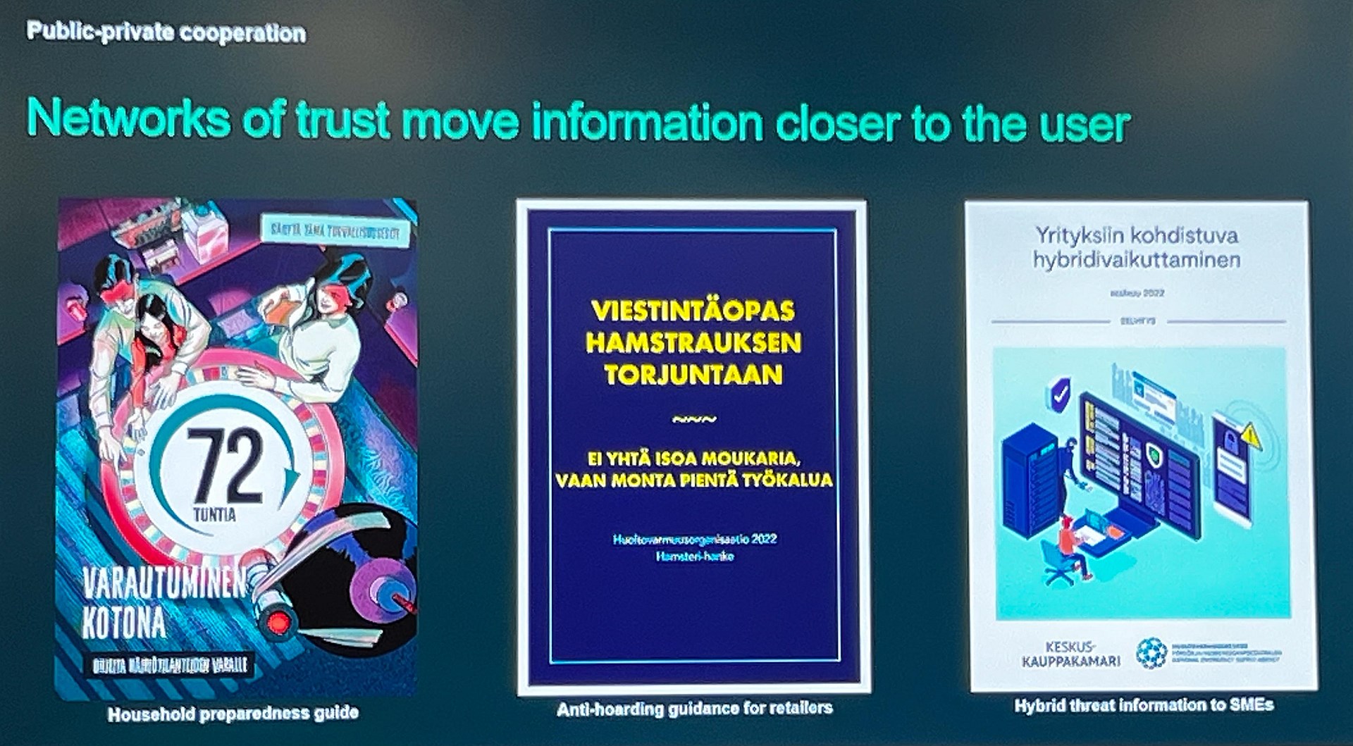 Með þessu sköpum við tengslanet allra þessara ólíku aðila og er einkageirinn þar ekki undanskilinn. Núna er Finnland tilbúið fyrir óvænta atburði. Við höfum gefið út leiðbeiningar fyrir almenning um að fólk þurfi að hafa á heimilum sínum áætlun fyrir 72 klst. Það þarf að hafa tryggt sér mat, vatn, útvarp, rafhlöður o.fl. ef til neyðarástands kemur.
