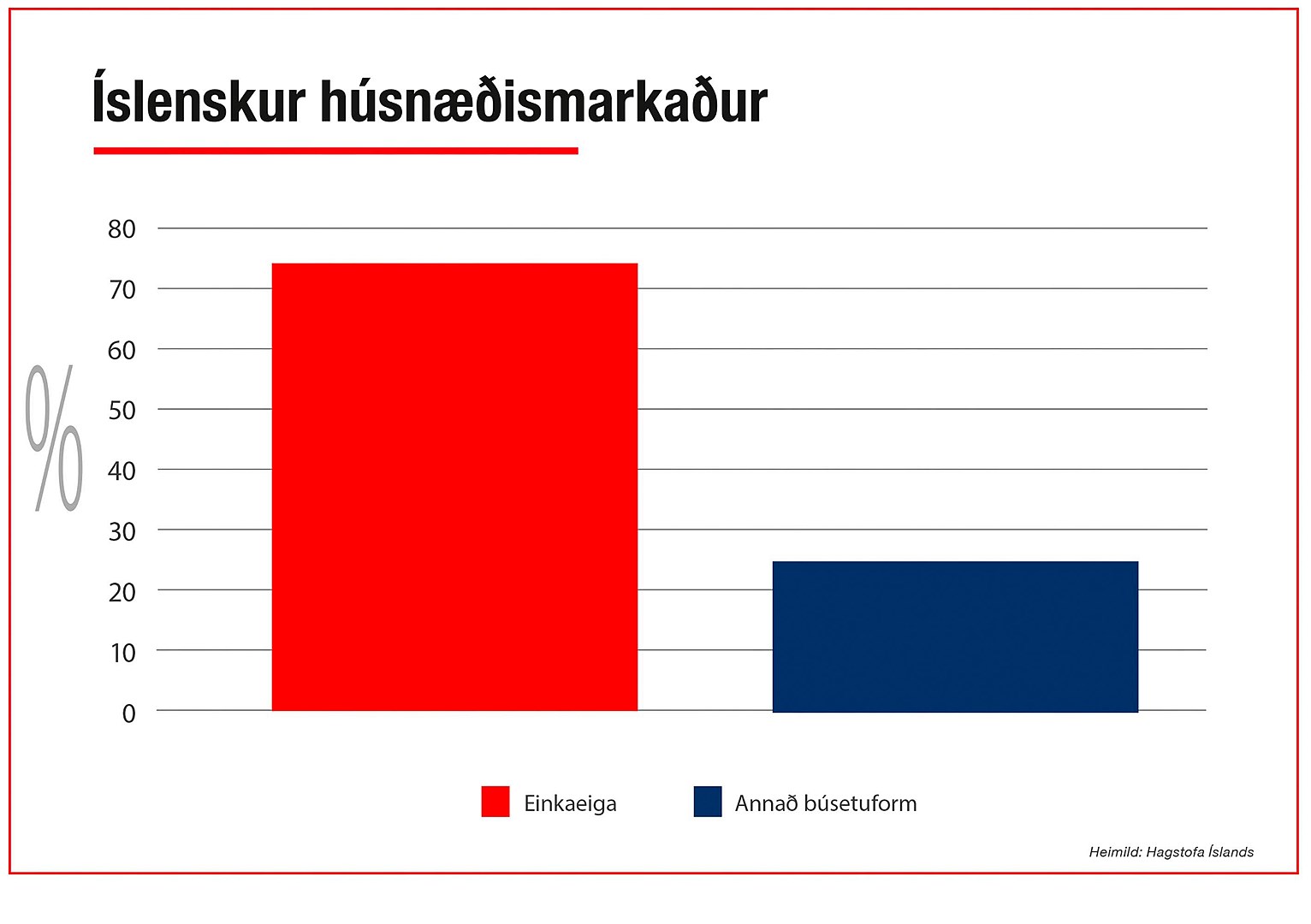 Á Íslandi hefur opinber stefna undangengna áratugi verið að einstaklingar eigi eða eignist sitt íbúðarhúsnæði og þá með aðstoð banka og fjármögnunarfyrirtækja. Í samanburði við norræn lönd hefur lítið verið um leigumöguleika og eignir í hlutdeildar- eða búseturéttarfyrirkomulagi. Samkvæmt upplýsingum frá Hagstofu Íslands eru um 162 þúsund íbúðir á húsnæðismarkaði og tæplega 80% þeirra eru í eigu einstaklinga. Þetta þýðir að aðeins rúmlega 20% íbúða eru á leigumarkaði eða í öðru formi búsetu.
