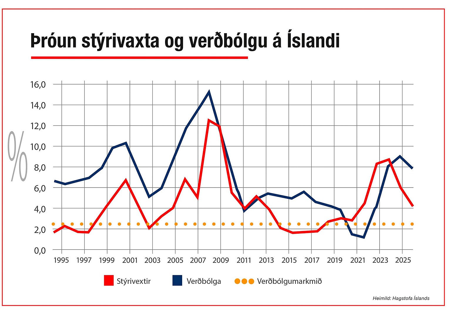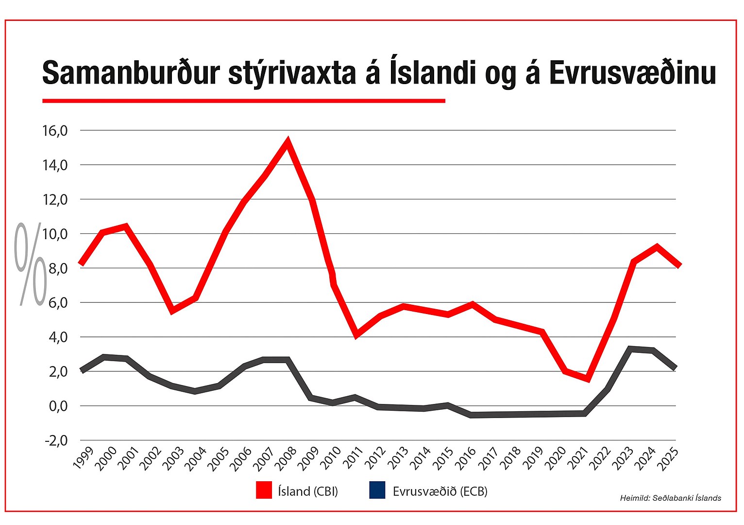 Vaxtastigið hér á landi hefur alla tíð verið hátt og verulega hærra en í þeim löndum sem Íslendingar bera sig helst saman við sem eru Norðurlöndin. Þrátt fyrir háa vexti á Íslandi hefur það ekki komið í veg fyrir þráláta verðbólgu sem á þessari öld hefur að verulegu leyti orsakast af háu og vaxandi húsnæðis- og leiguverði.