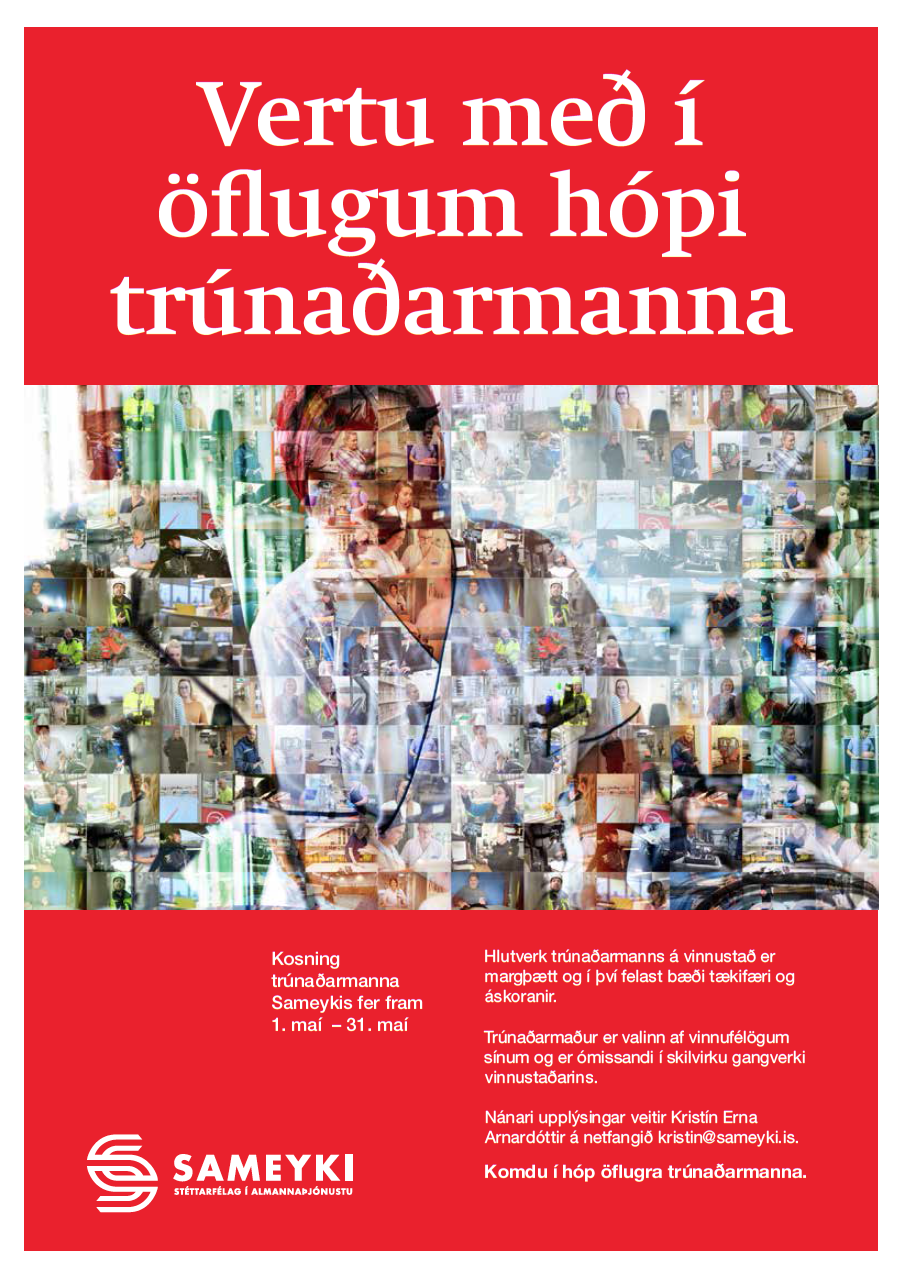 Kosið er til trúnaðarmanns í maí á oddatöluári og gildir kjörið í tvö ár. Trúnaðar­maður er fulltrúi starfs­fólks gagnvart atvinnu­rekanda og Sameyki. Kosning fer fram í samráði við Sameyki og trúnaðarmaður fær kjör sitt og umboð staðfest af félaginu.